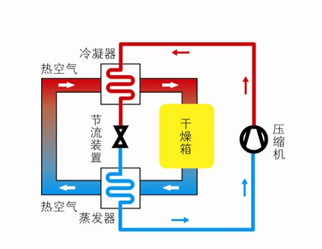 熱泵系統(tǒng)由壓縮機(jī)、冷凝器、節(jié)流裝置和蒸發(fā)器組成,系統(tǒng)內(nèi)運行的工質(zhì),在蒸發(fā)器中吸取干燥室排出濕熱空氣中的熱量,從低壓液態(tài)工質(zhì)蒸發(fā)成低壓蒸汽,經(jīng)壓縮機(jī)增壓成為高溫高壓的蒸汽;在冷凝器中,高溫高壓的工質(zhì)蒸汽放出熱量加熱進(jìn)入干燥室的空氣,而工質(zhì)本身則從氣體冷凝成高壓液體;通過節(jié)流裝置,液體工質(zhì)產(chǎn)生阻塞效應(yīng),降低了壓力和溫度,成為低壓低溫液體,再度進(jìn)入蒸發(fā)器中吸收濕熱氣體的熱量,如此反復(fù)循環(huán)將低溫?zé)崃枯斔偷礁邷亟橘|(zhì)中去,形成熱泵循環(huán)。